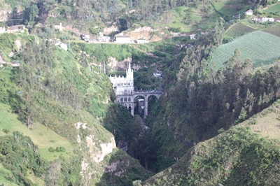 We admire the Shrine of Our Lady of Las Lajas, nestled deep in the valley.