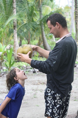 We refresh ourselves by opening some coconuts.
